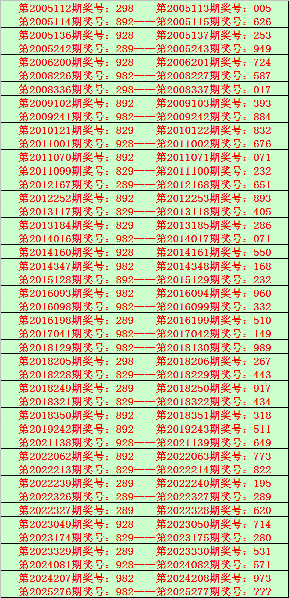 排列三第2025276期开出奖号982,该号码历史上组选出现44次,前43次开出之后期下期奖号为:005、626、253、949、724、587、017、393、884、832、676、071、232、651、893、405、286、071、550、168、232、960、332、510、149、989、267、443、917、434、318、511、649、773、822、195、289、620、714、280、531、571、973,详见下表: