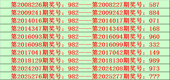 排列三第2025276期开出奖号982,该号码直选类型历史上出现了10次,前9次开出之后期下期奖号为:587、884、071、168、960、332、149、989、973,见下表: