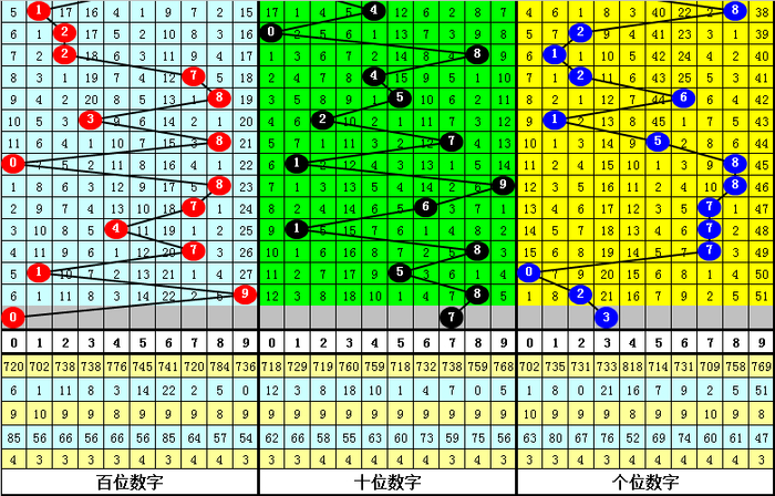 目前个位最冷号码为9,遗漏51期,历史上该号码最大遗漏为51期,本期预计个位号码9继续走冷。